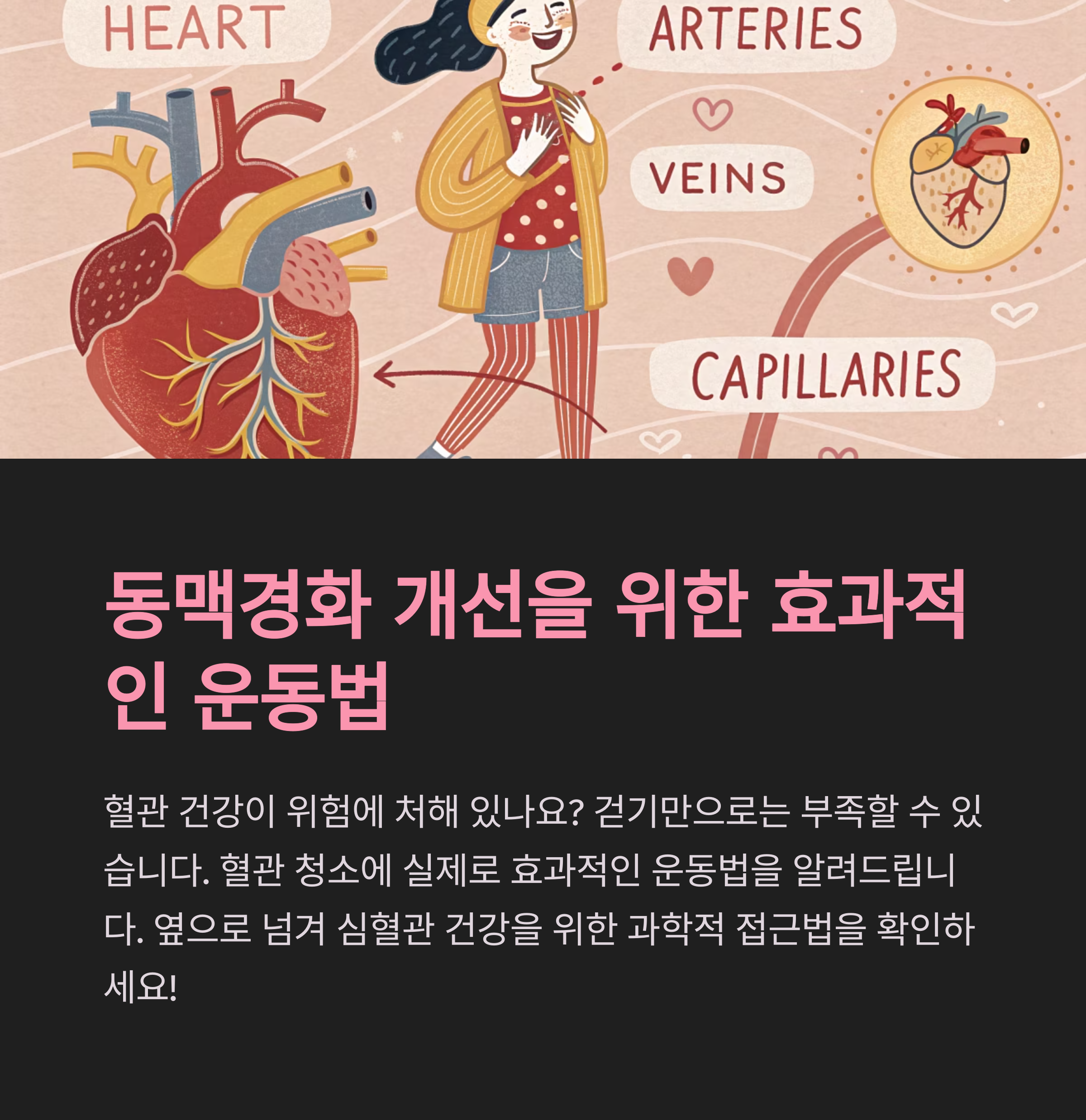 "꾸준함 + 점진적 강도 증가 + 회복 리듬 확보" 이 세 가지가 동맥경화 개선의 핵심입니다.