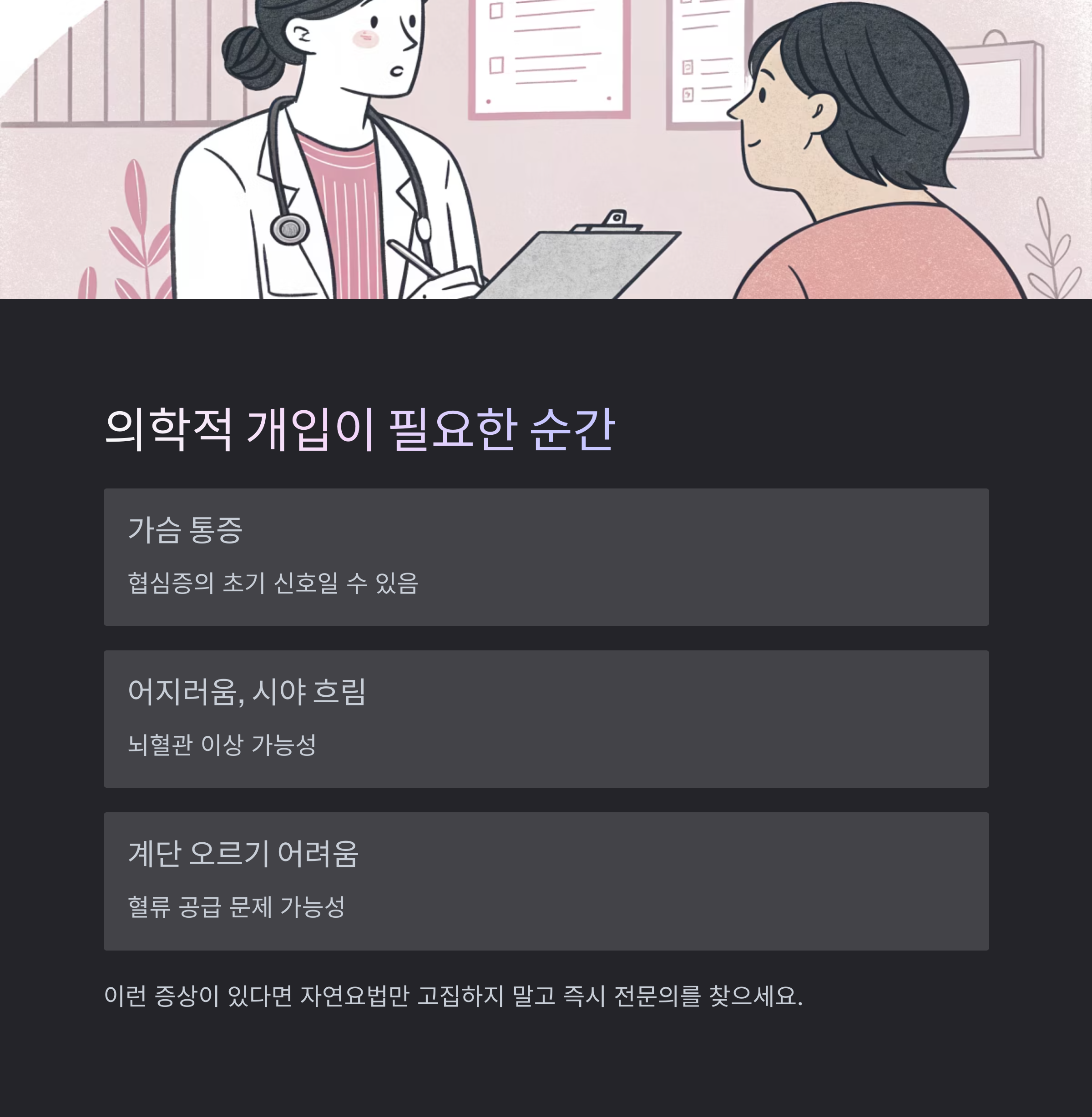 자연요법을 시도하더라도 다음과 같은 증상이 있을 경우 즉시 전문 진료가 필요합니다.