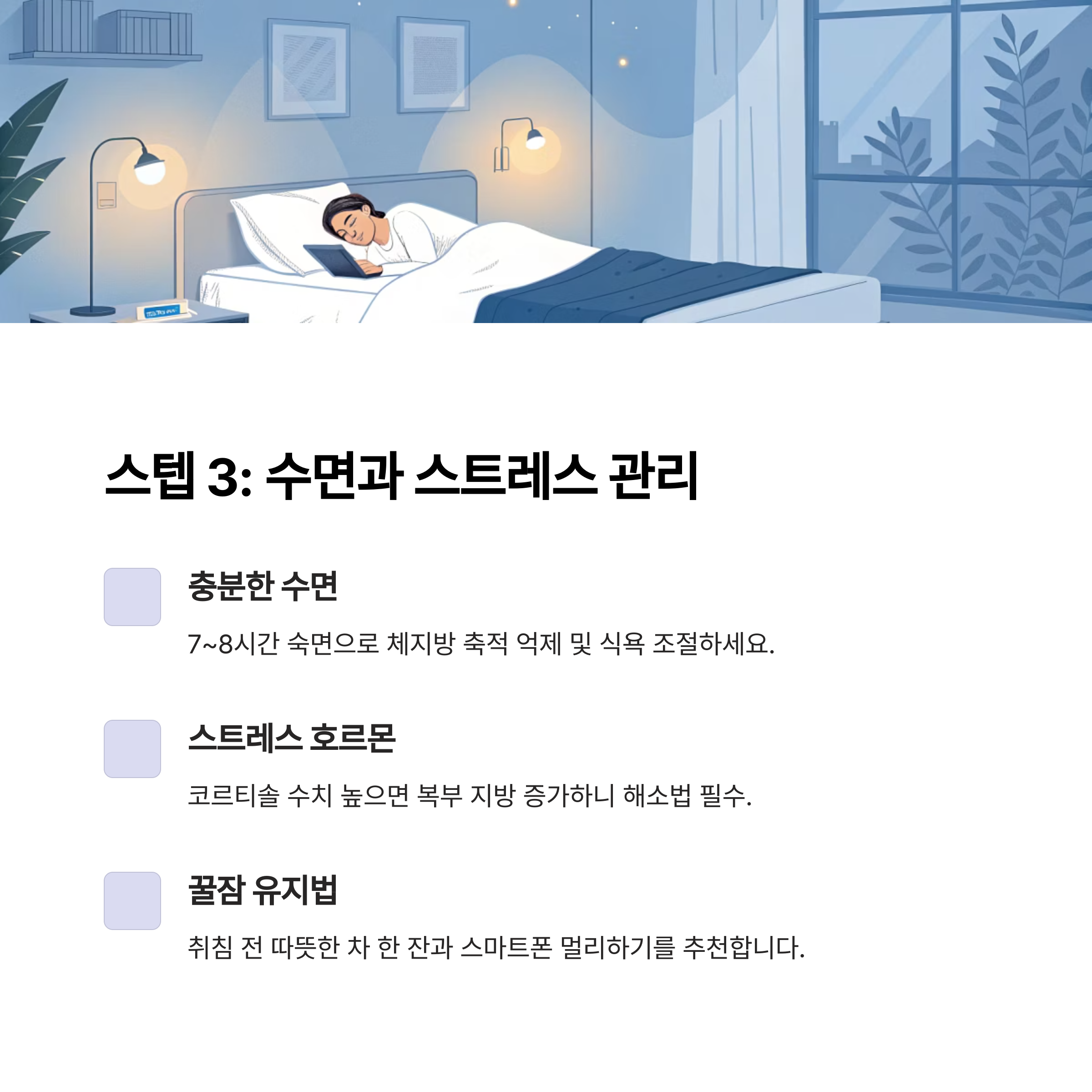 수면과 스트레스 관리는 감량 속도를 2배 이상 빠르게 합니다.