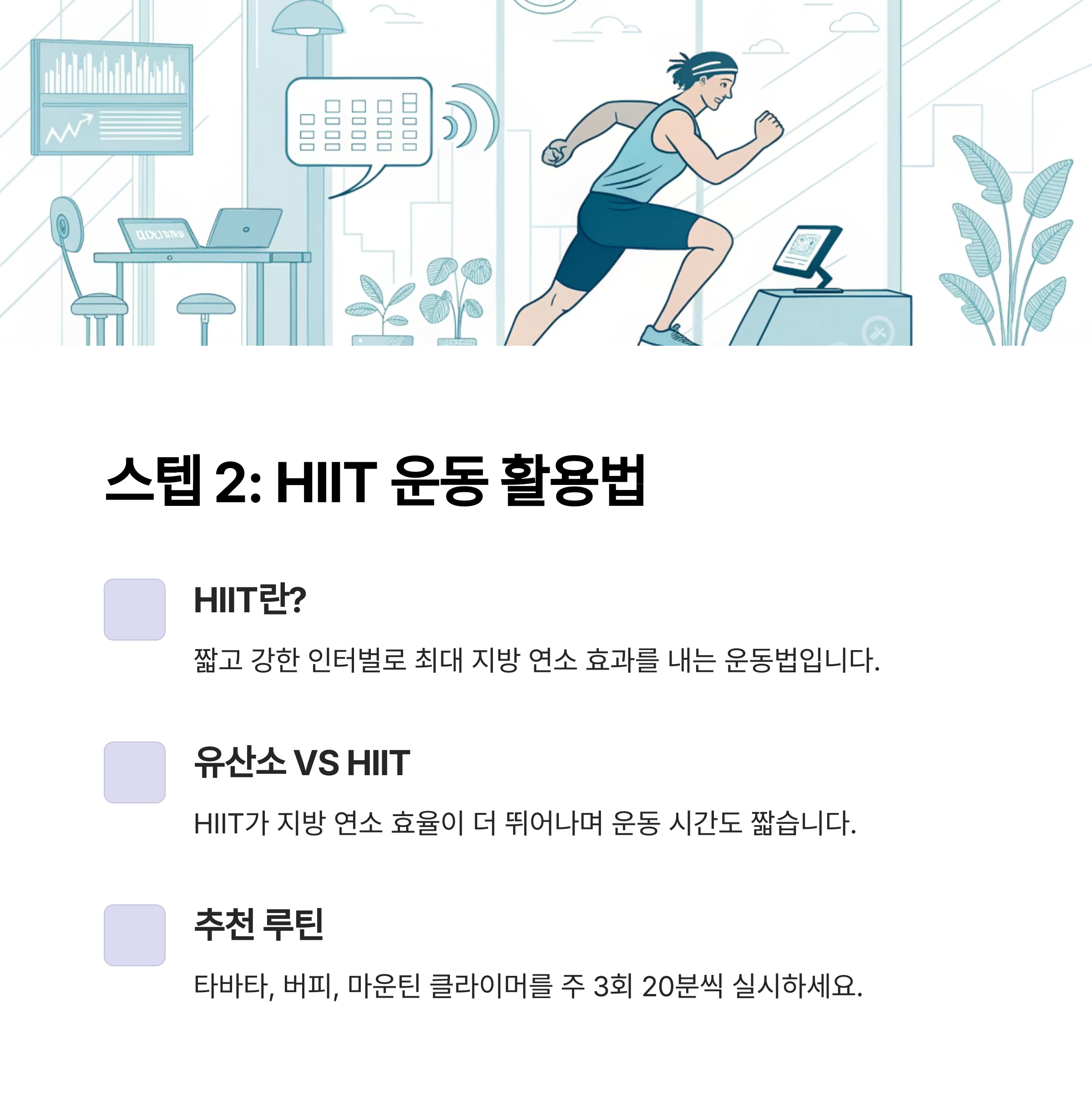 첫째, 주 3회 이상 HIIT를 실시하세요. 20분만 투자해도 효과는 대단합니다.
