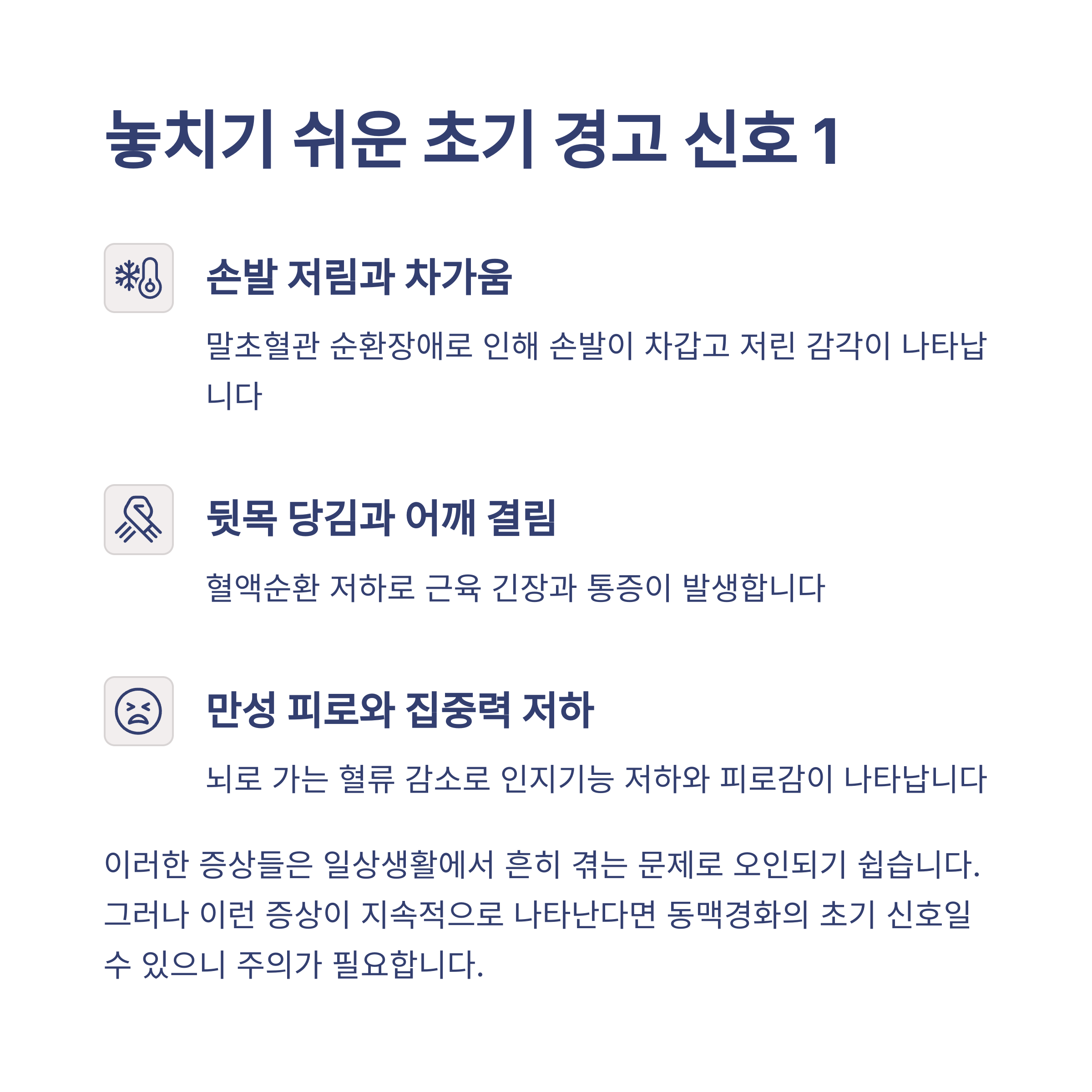 이 글에서는 무심코 지나칠 수 있는 동맥경화의 대표적인 초기증상과 이를 절대 무시하면