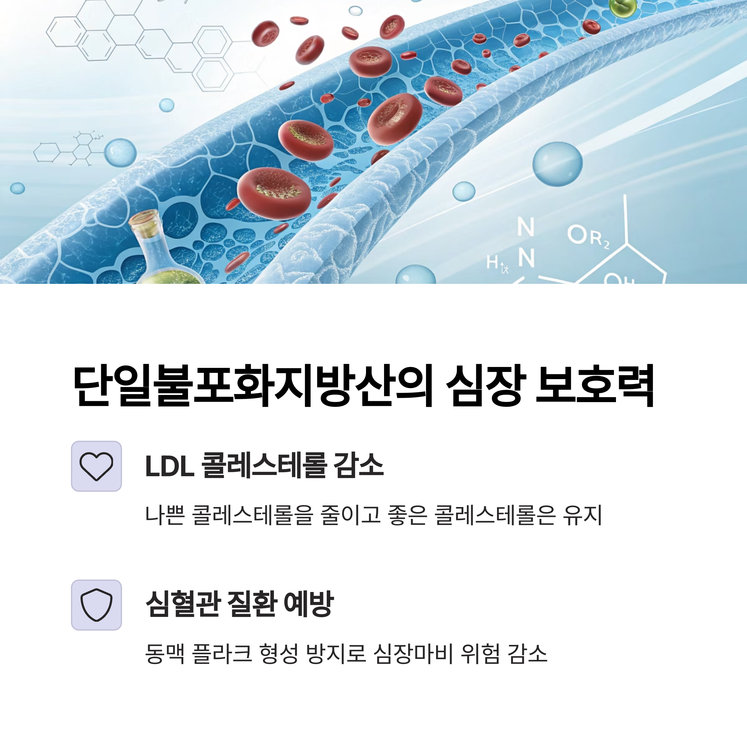 특히 단일불포화지방산이 풍부하며, 항산화 성분과 항염 작용이 뛰어나 심장 질환 예방에 핵심적인 역할을 합니다.