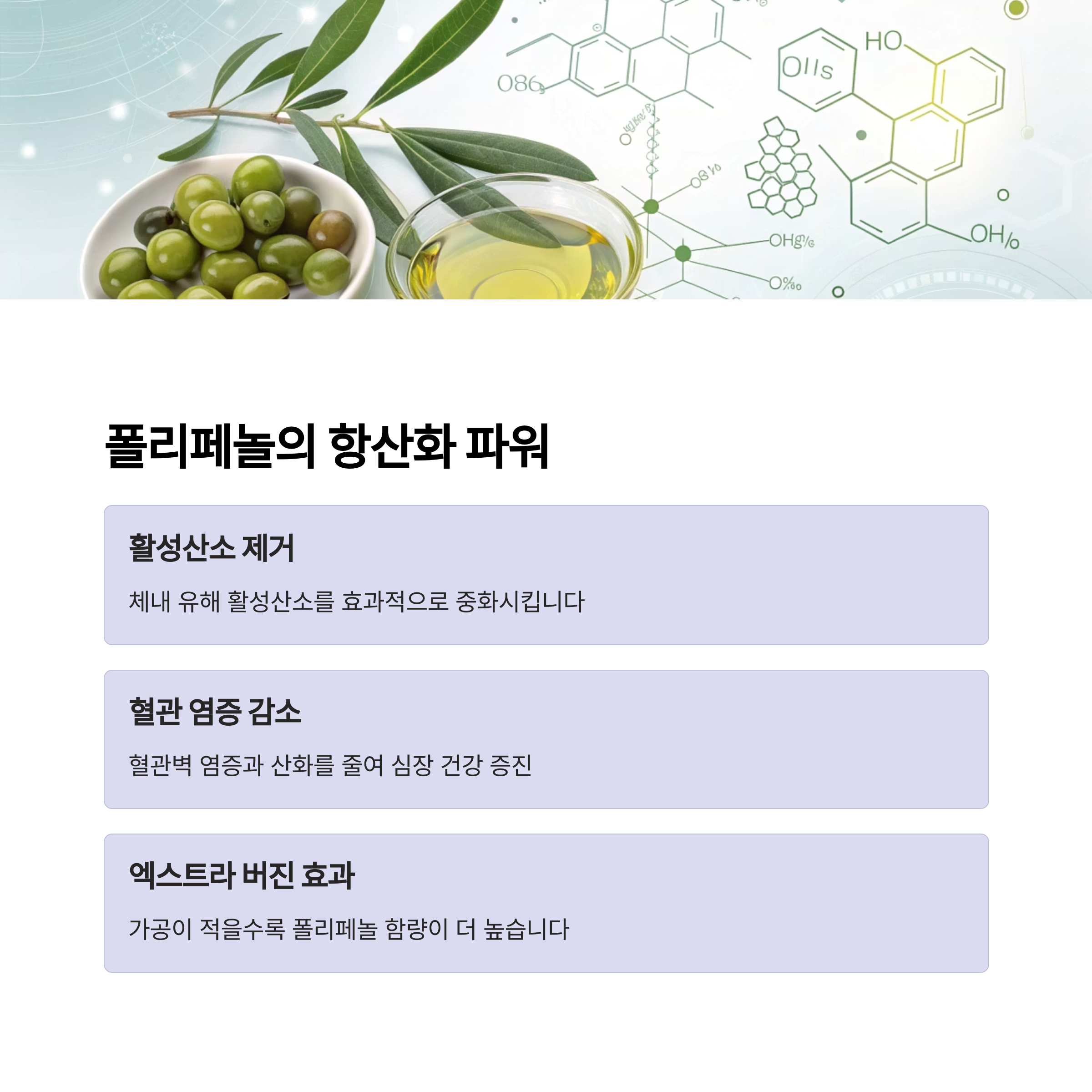특히 엑스트라 버진 올리브유에는 가공이 거의 되지 않아 폴리페놀 함량이 더욱 높습니다.