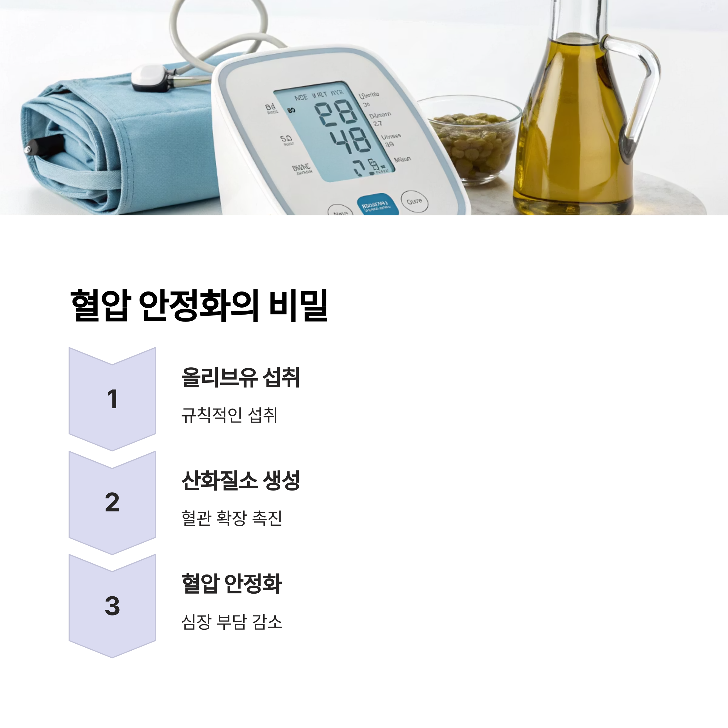 특히 고혈압 초기 단계에서의 꾸준한 올리브유 섭취는 약물 없이도 혈압 개선에 긍정적입니다.