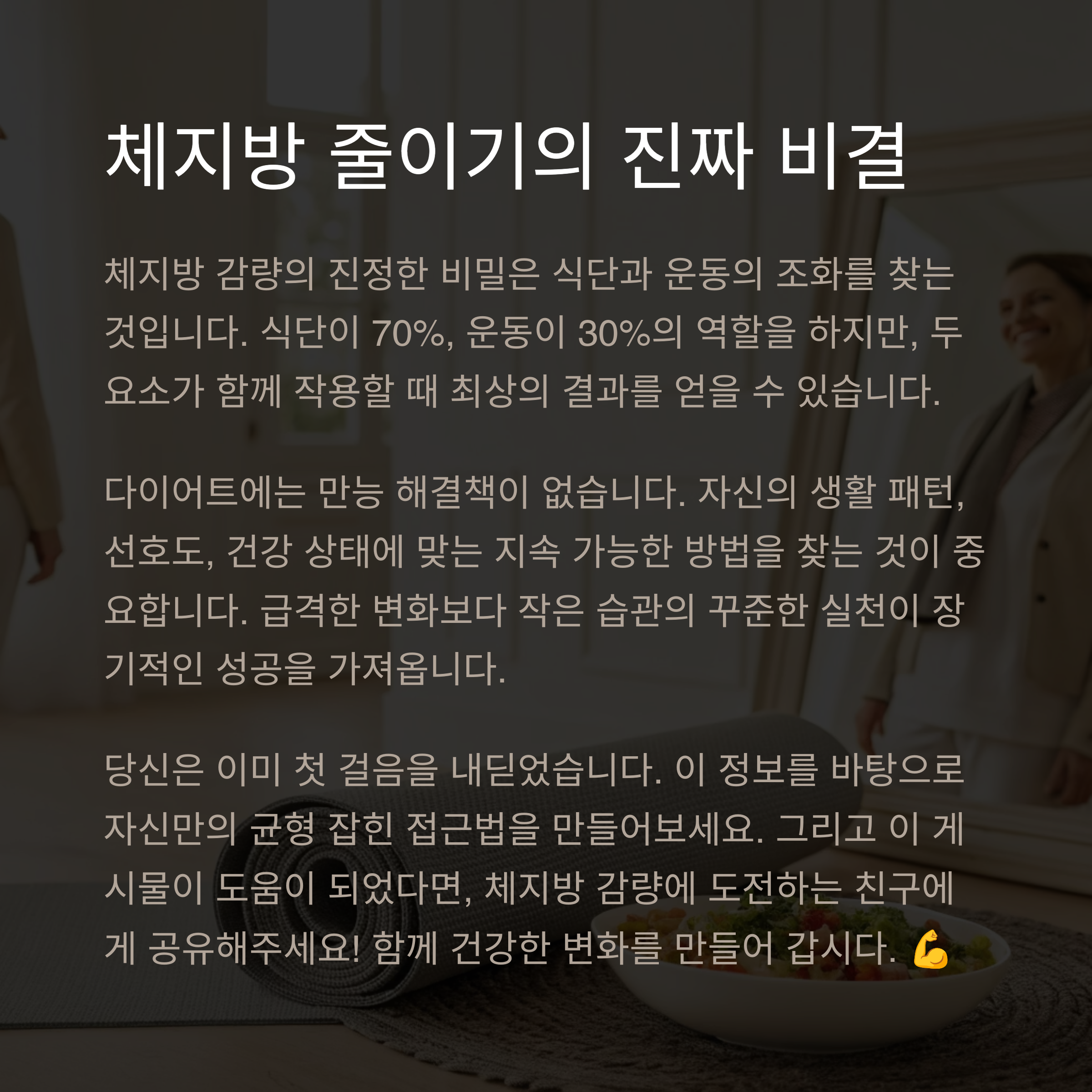 "체지방을 줄이기 위해서는 식단과 운동을 함께 관리하는 것이 필수입니다."