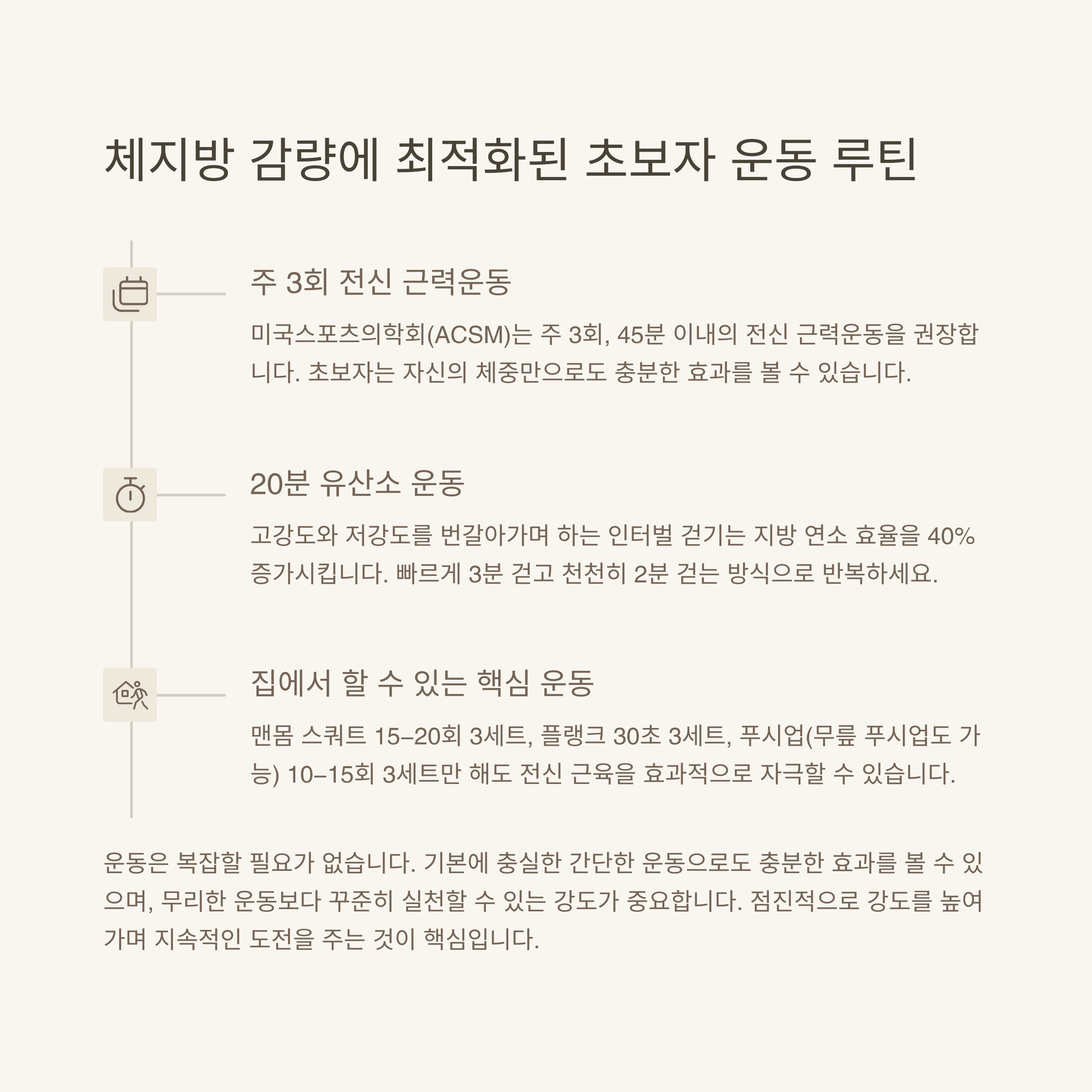 여기에 스쿼트, 런지, 플랭크 같은 기본 근력 운동을 추가하면 더욱 효과적입니다.
