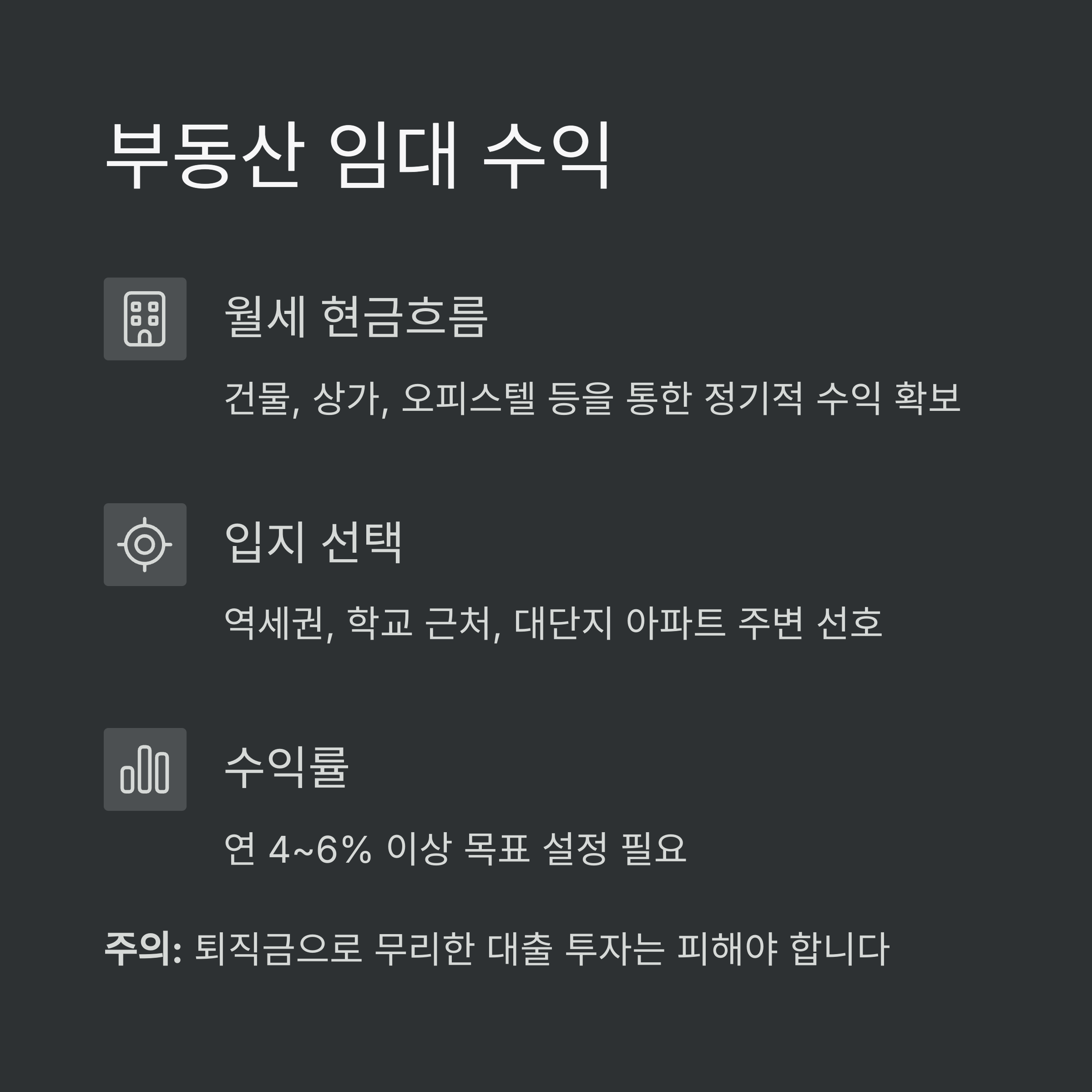 중요: 퇴직금으로 무리한 대출을 끌어와 투자하는 방식은 피해야 합니다
