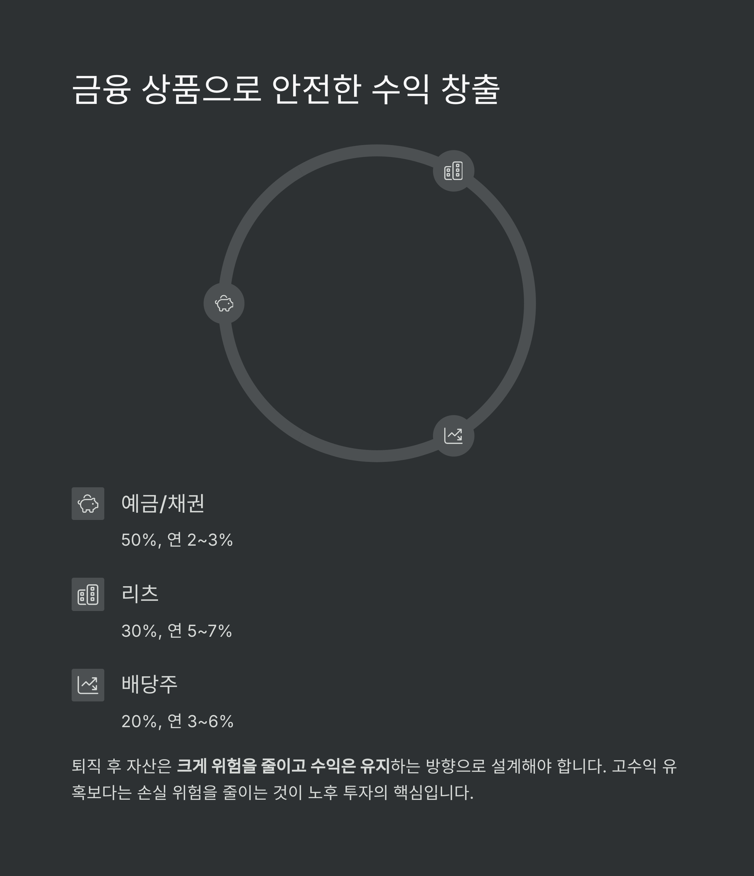 퇴직 후 자산은 크게 위험을 줄이고 수익은 유지하는 방향으로 설계해야 합니다.