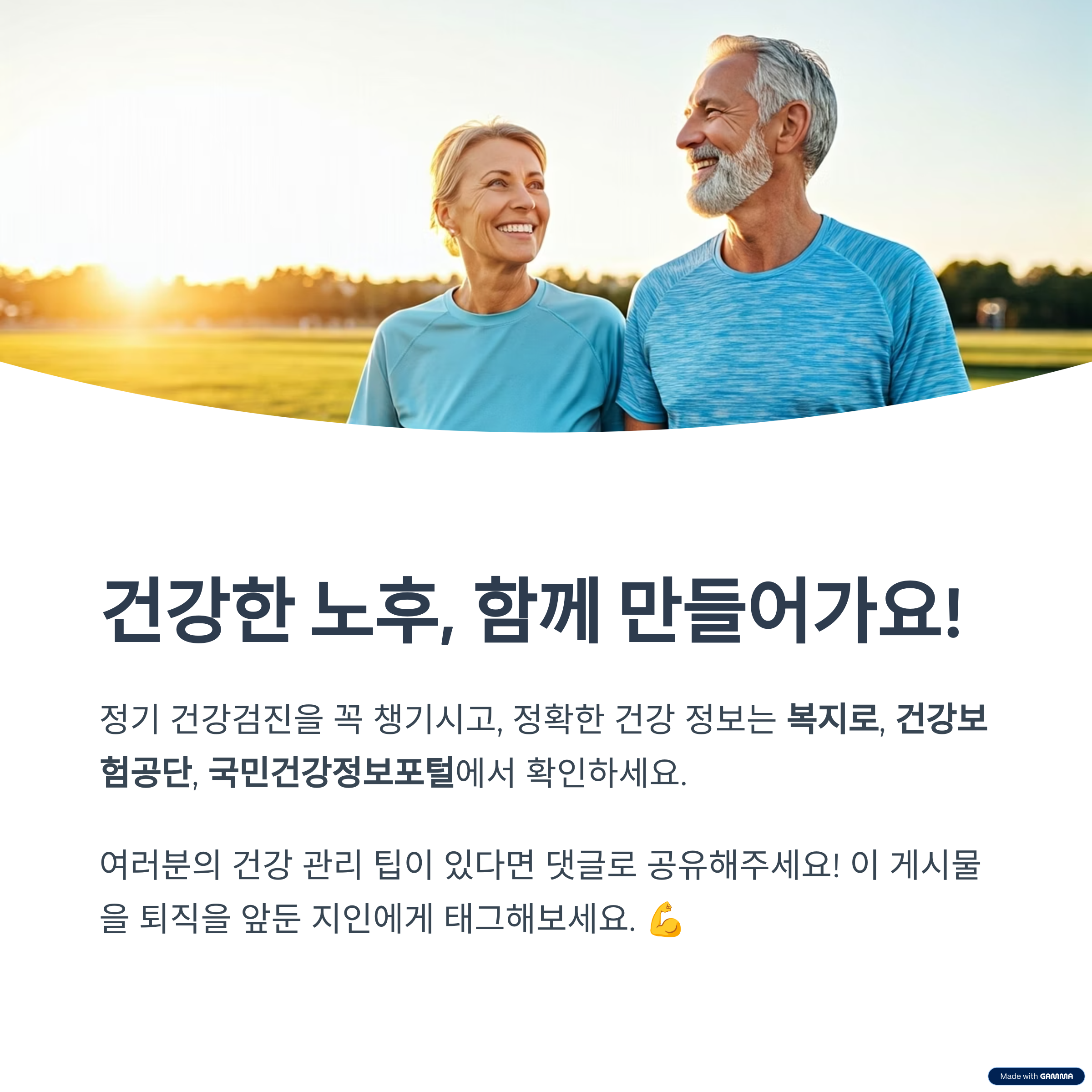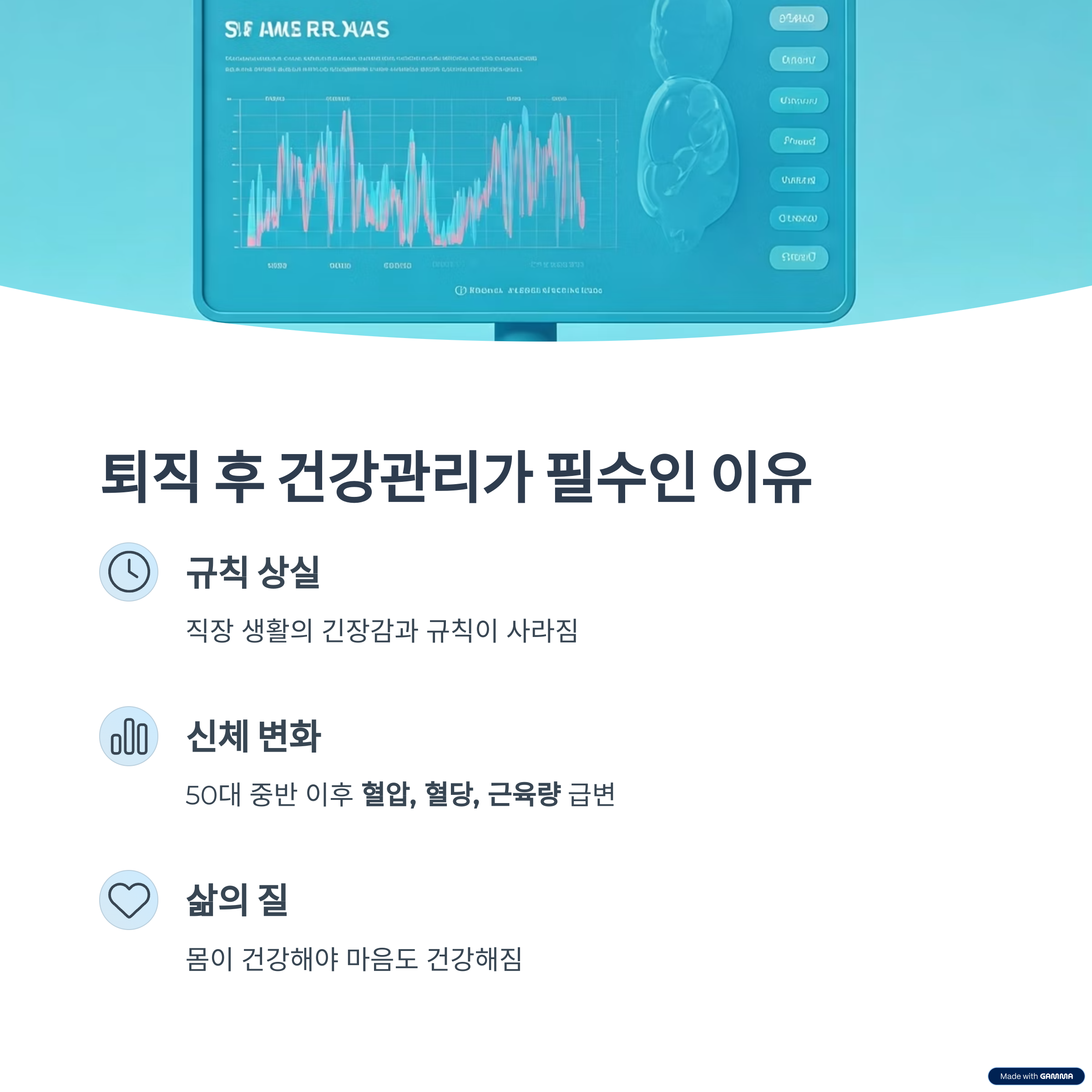 퇴직 후에는 직장에서 받던 긴장감이나 규칙이 사라지면서 체력이 급격히 떨어질 수 있어요. 활동량도 줄고, 불규칙한 식사나 수면으로 건강에 적신호가 오기 쉬운 시기죠.