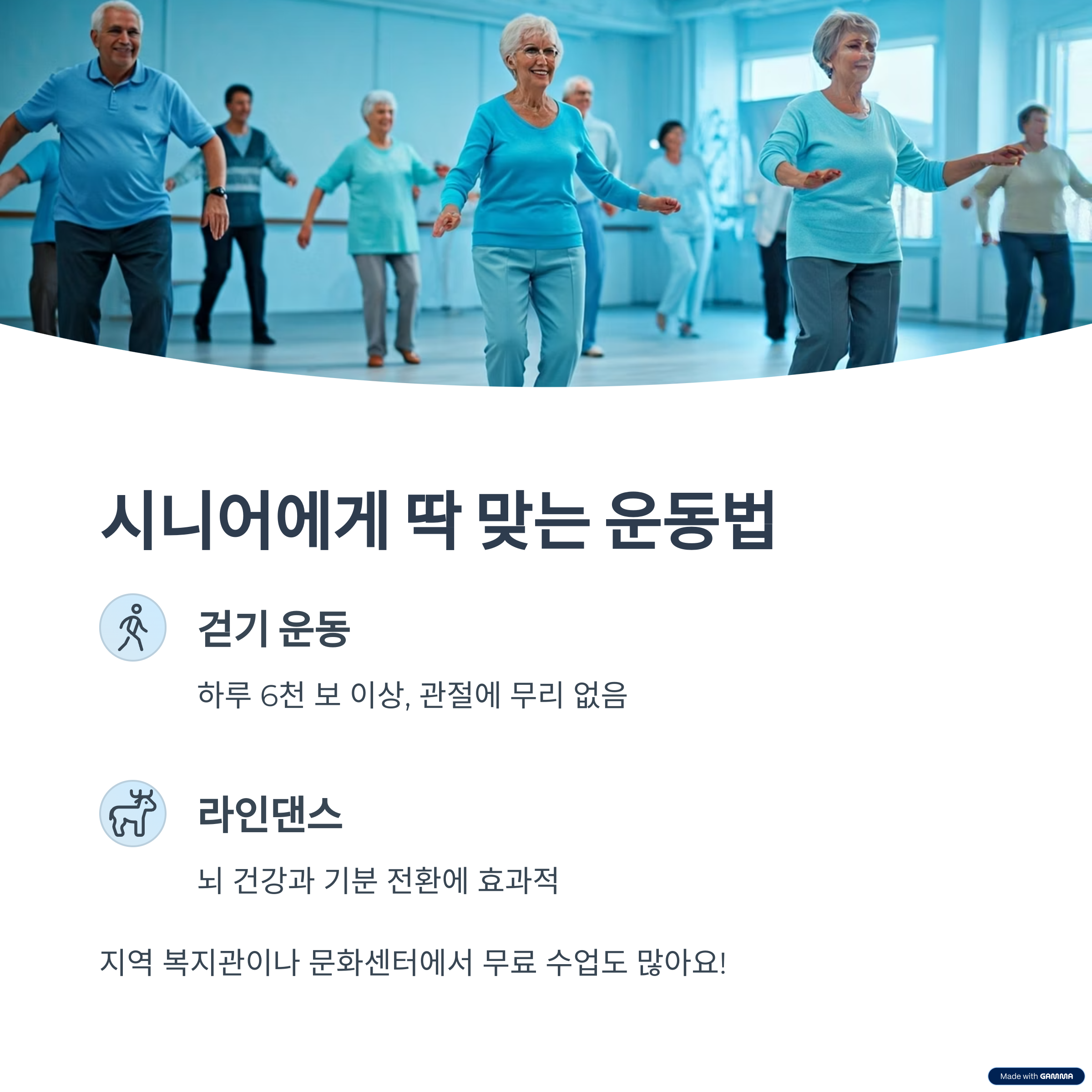 A. 걷기, 수영, 라인댄스 등이 관절에 무리 없이 지속하기 좋아요.
