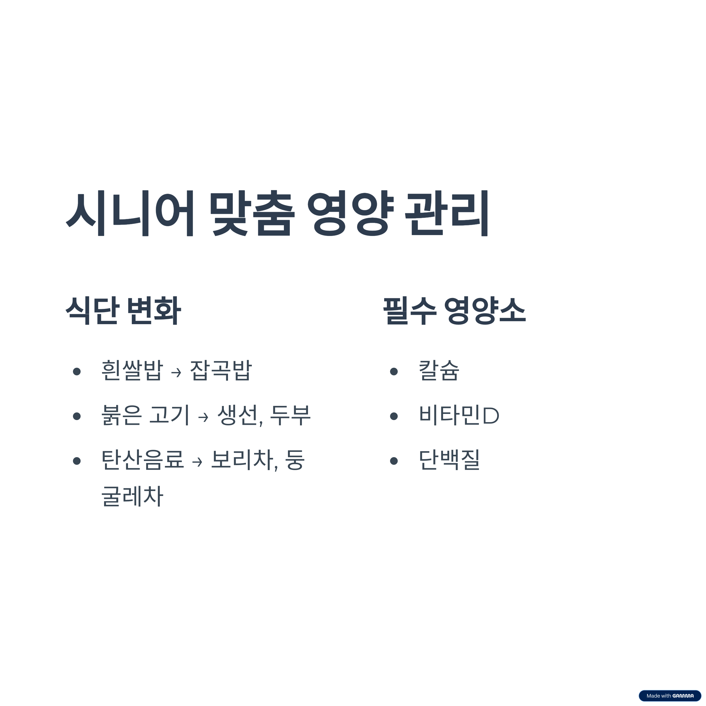 A. 칼슘, 비타민D, 오메가3, 고단백 보충제 등이 추천되지만,