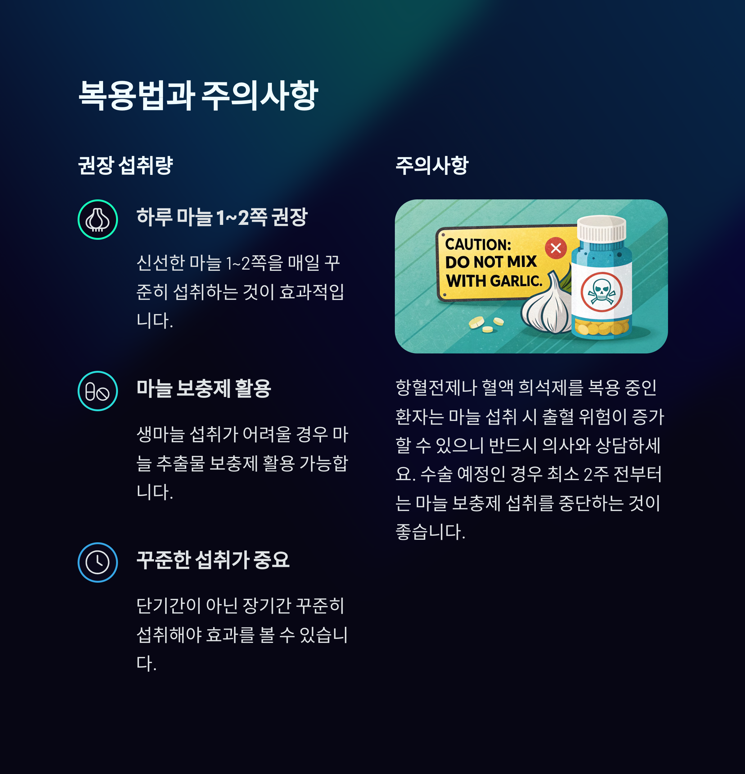 따라서 균형 잡힌 식단과 생활습관 개선 없이 마늘만으로 해결하려는 생각은 위험할 수 있습니다.